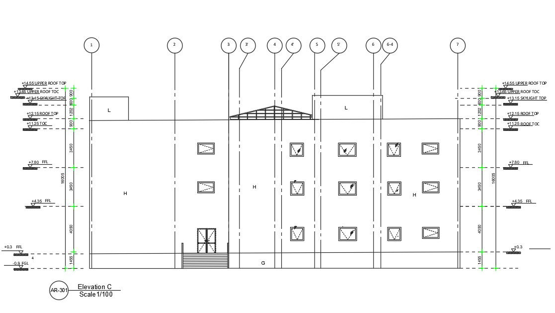 The Architecture hospital building rear side elevation design that shows number of window marking back side gate for staff, floor level building structure design and center line with dimension detail. download 3 level hospital building drawing DWG file.