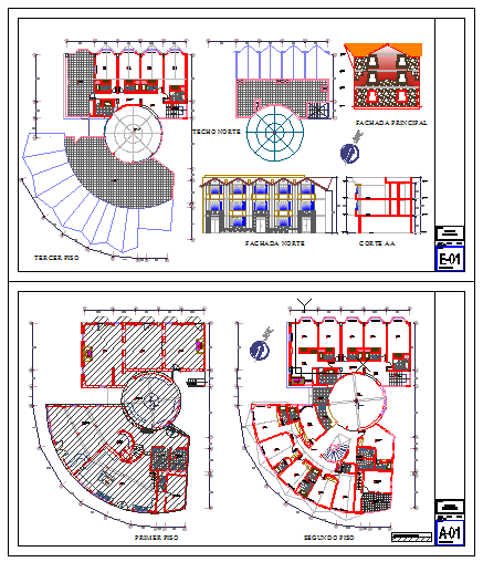 This is a semi circular style Hotel design with first and second floor layout with elevation and section drawing available.