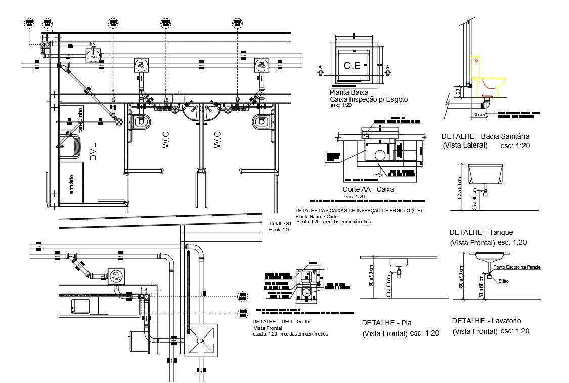 The corporate office building toilet plan and sanitary ware with piping installation detail CAD drawing which includes the sewer inspection boxes, marking the point conference sanitary piece, sewer point on the wall and concrete walls can be replaced by PVC (commercial standard). The pipes and accessories for drainage and ventilation, will be of PVC rigid sap of union to simple pressure, heavy and lightweight. download free toilet plumbing drawing DWG file.