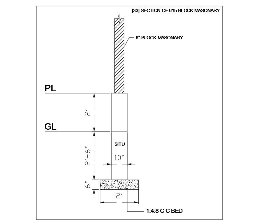 AutoCAD free CAD blocks drawing of RCC flooring and masonry blocks wall with levels shown are from developed ground level and measurement dimension detail.