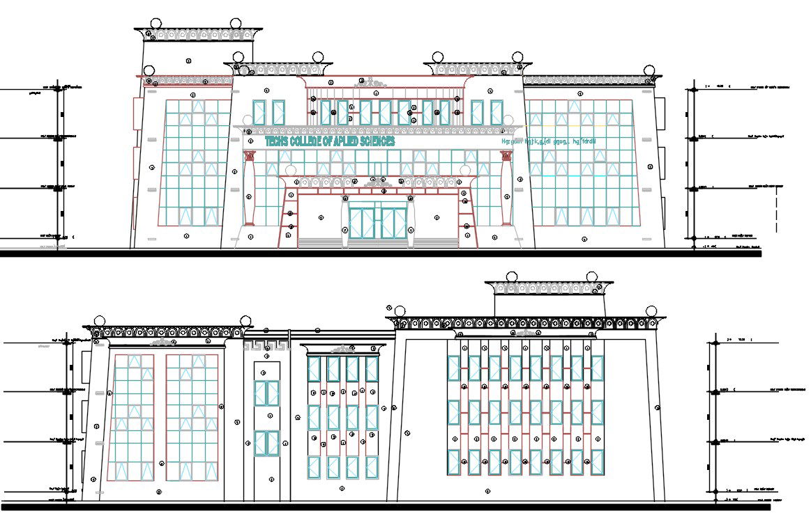 The Technical college building front and side elevation design that shows main entrance gate, curtain glass wall, floor level building structure, and measurement detail. the carrying forward the momentum of this effort to open space. download architecture college building elevation design DWG file.
