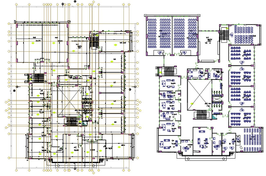 The technical college working plan with center line and dimension detail shows class rooms, meeting room, library, computer lab, research center room, cafeteria, professor cabins, auditorium hall and principal office with all furniture design. download architecture college layout plan drawing DWG file.