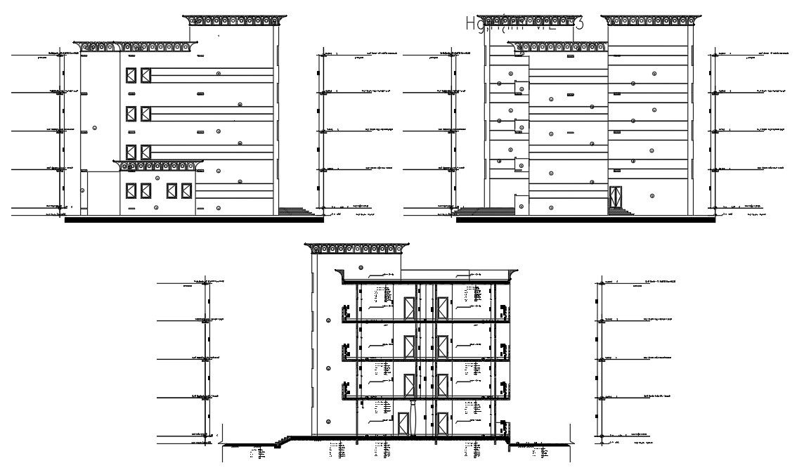 AutoCAD drawing of college building sectional elevation drawing that shows 3 storey floor level building structure design, RCC slab, wall section and terrace railing wall with dimension detail. download free college building drawing DWG file.
