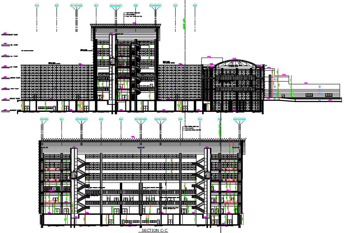 The modern building sectional elevation drawing of shopping mall project that shows proper planning understanding design with knowledge of the business requirements. find here floor level building structure, curtain glass wall and transparent lift with spiral staircase. download architecture model building shopping mall with center line detail. download architecture shopping mall building drawing DWG file.