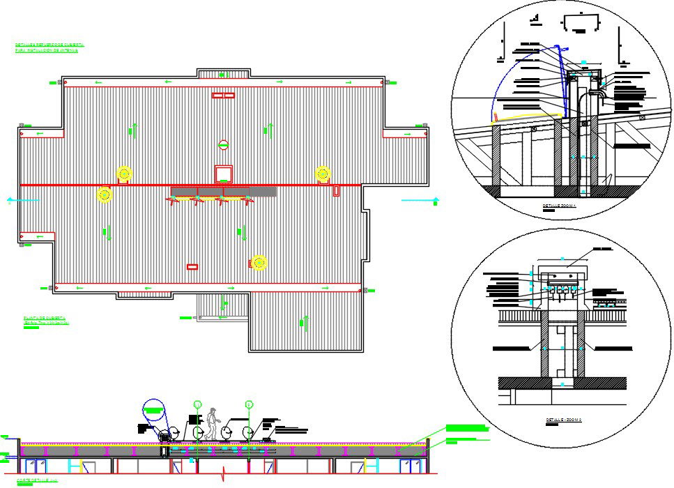 AutoCAD drawing of truss span roof anatomy roofing top view plan and section drawing which includes low slope roof covered with alternating layers design. download free roof joint structure drawing DWG file.