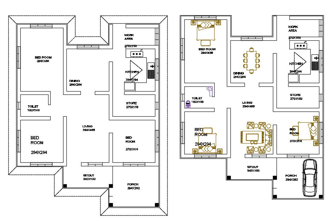 The car parking house ground floor plan drawing that shows modular kitchen, 3 bedrooms, living room, 1 toilet, dining room, store room, sit out area, wash area and car parking porch space with furniture layout design. download single storey 2 BHK house plan drawing DWG file.