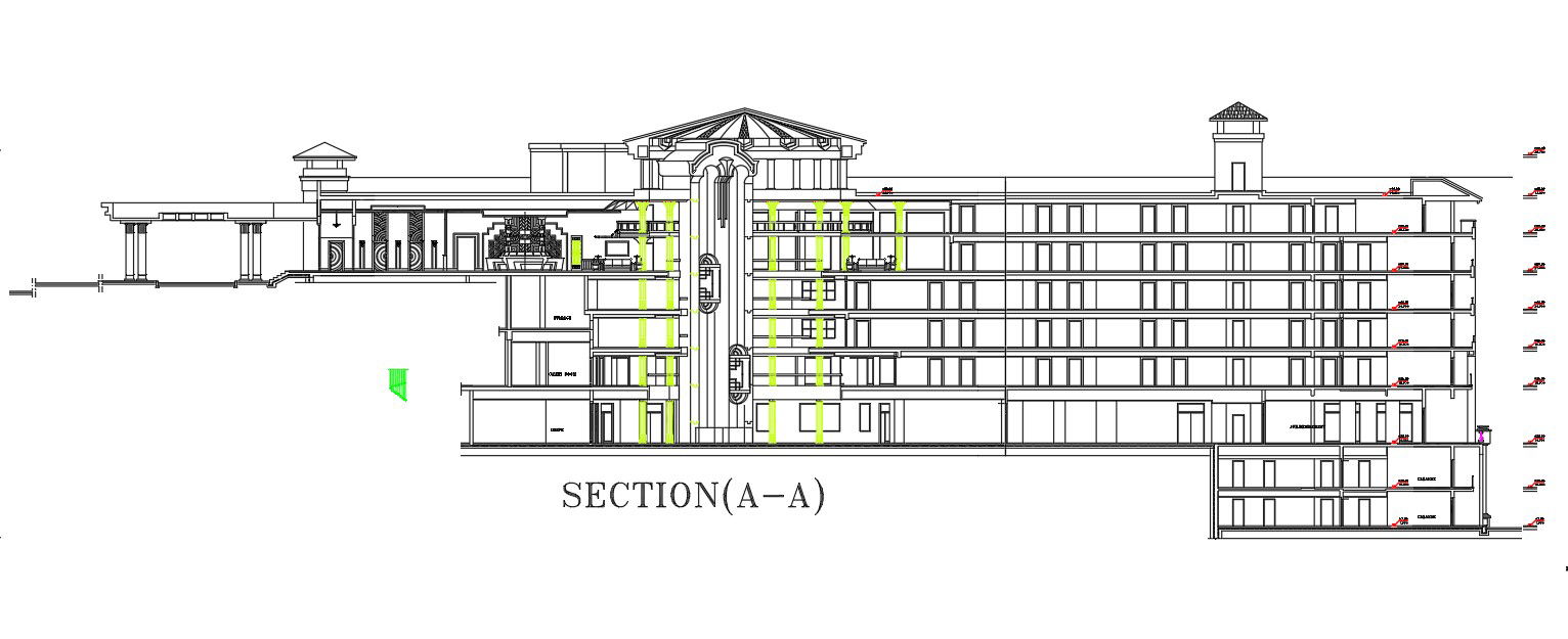 AutoCAD DWG 2D drawing of the Front elevation and section details of the hotel building. Download the AutoCAD DWG file.