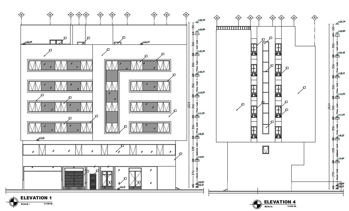 2D CAD drawing of the other two various side elevation details of the G+5 hotel building.Download the AutoCAD DWG file.