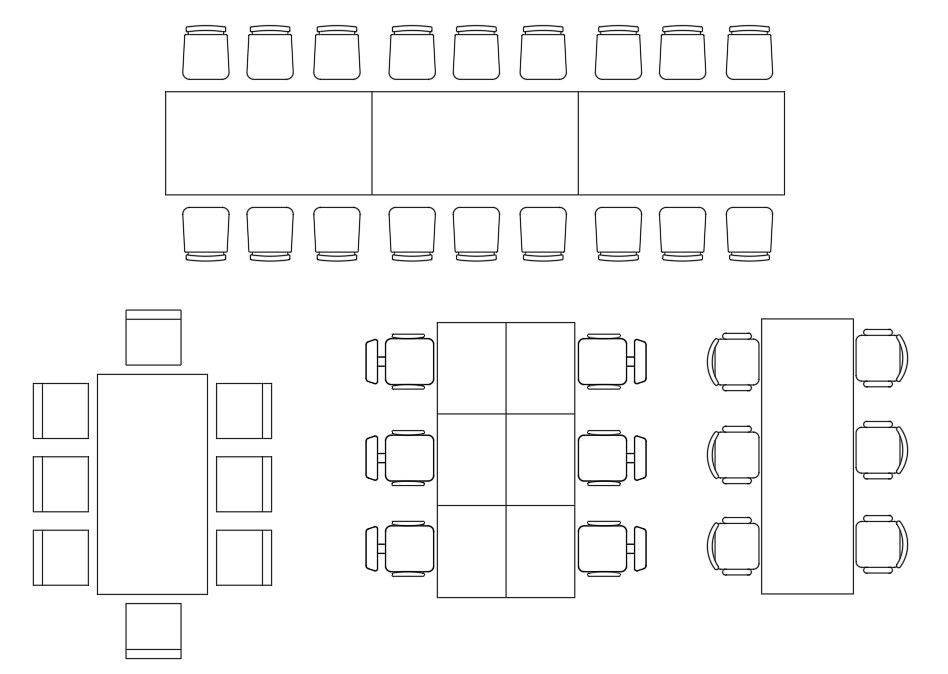 Download free AutoCAD drawing of dining table and chair design that shows 4 different option that shows size, rectangle shaped, and model design.