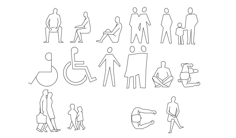 Download free AutoCAD drawing of people symbol and shadow elevation design that shows standing and seating situation family, couple, male and female.