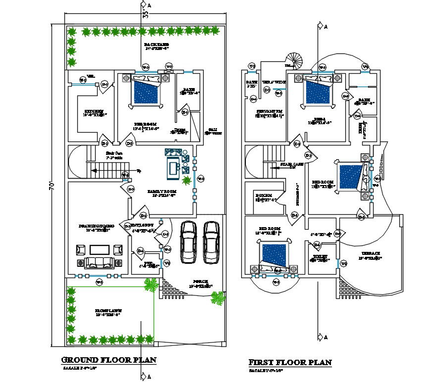 The plot size 35X70 feet for house ground floor and first floor plan with interior furniture layout drawing includes 4 bedrooms with an attached toilet, modular kitchen, family room, drawing room, servant room, in side staircase, open sky terrace, back yard, front lawn and 13'X16' car parking porch. the addition drawing such as measurement and dimension detail. download architecture house plan drawing DWG file.