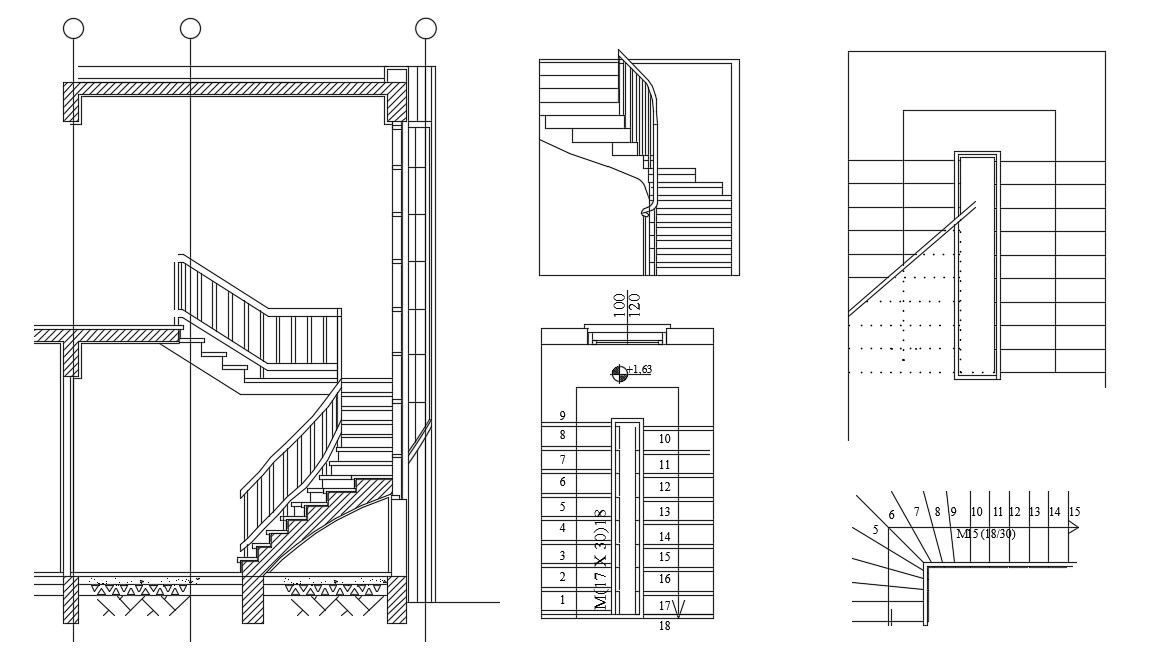 The staircase AutoCAD drawing includes top view plan, rise trade step,slab section, elevation with railing design. download free DWG file of staircase which is use in house.
