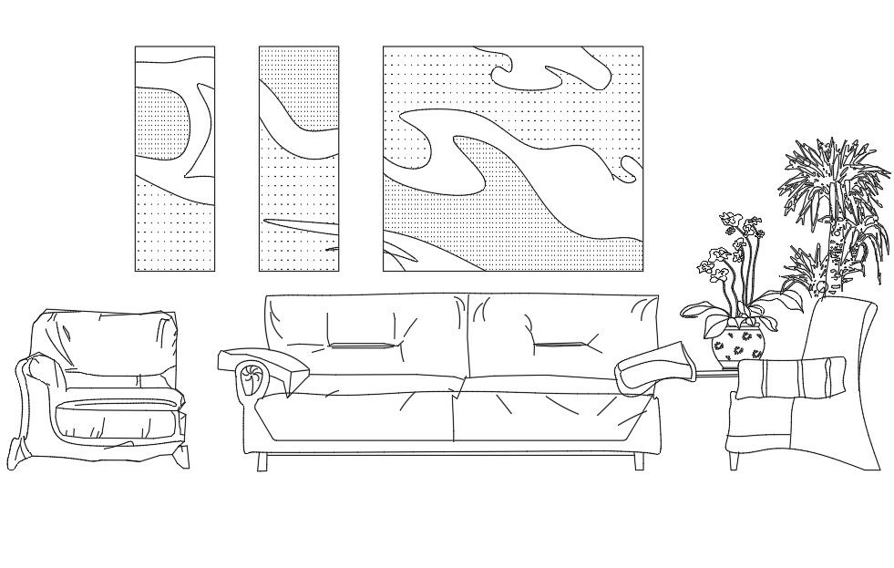 The living room sofa block and decorative wall art, and plants with pot blocks are given in this drawing.Download the AutoCAD DWG file.