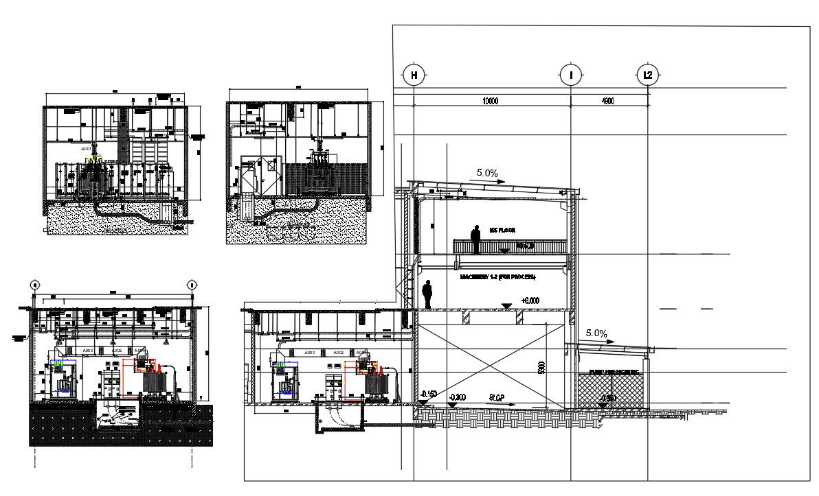 The AutoCAD DWG drawing file of the electrical transformer connection elevation and section details.Download now.