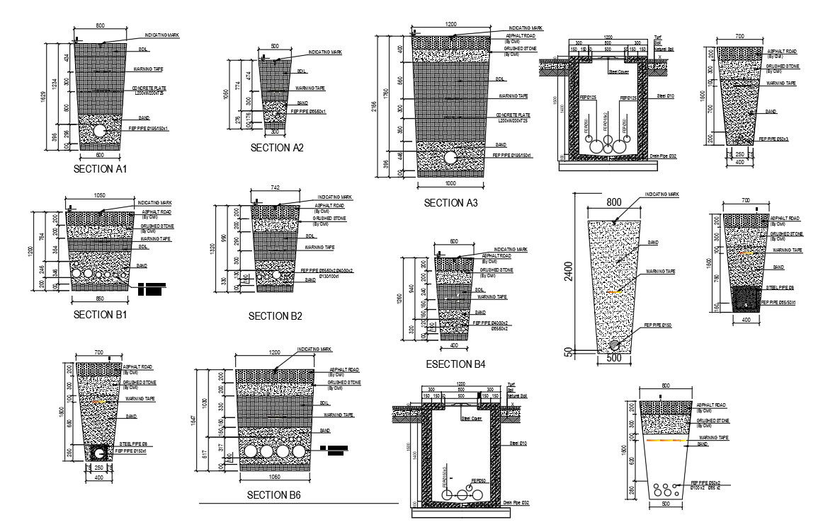 The DWG drawing file of the drain section details. Sectional details are clearly given in this drawing file. The Indicating mark, concrete plate , warning tape, FEP pipe are the details given in this DWG file. Download the AutoCAD DWG file. Thank you so much for downloading DWG file from our website