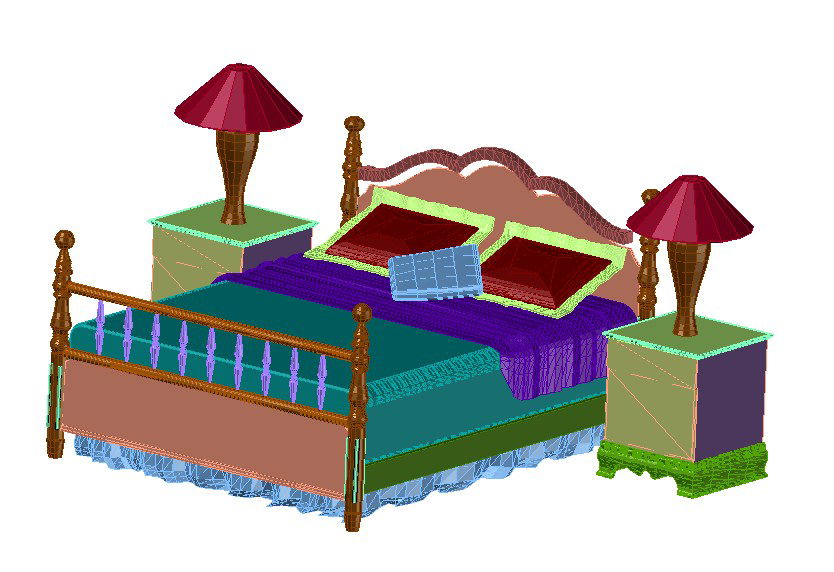 Detailed 3D CAD block of a double bed with two side lamp tables, perfect for interior design projects. Editable DWG format with precise furniture details.