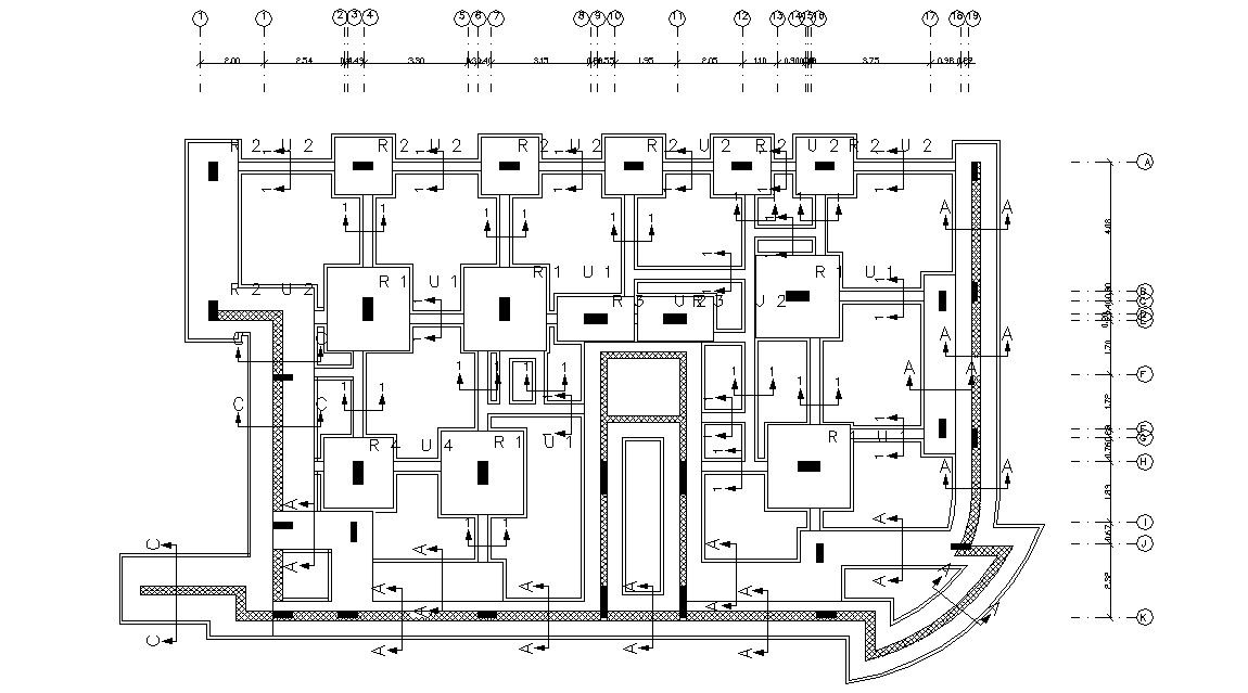 RCC shallow Foundation Pad footing design structural CAD plan that shows footing size, footing space, center line layout, dimension working sets, section line, column structure, and various other works details. Download structural works design of RCC pad footing CAD file.