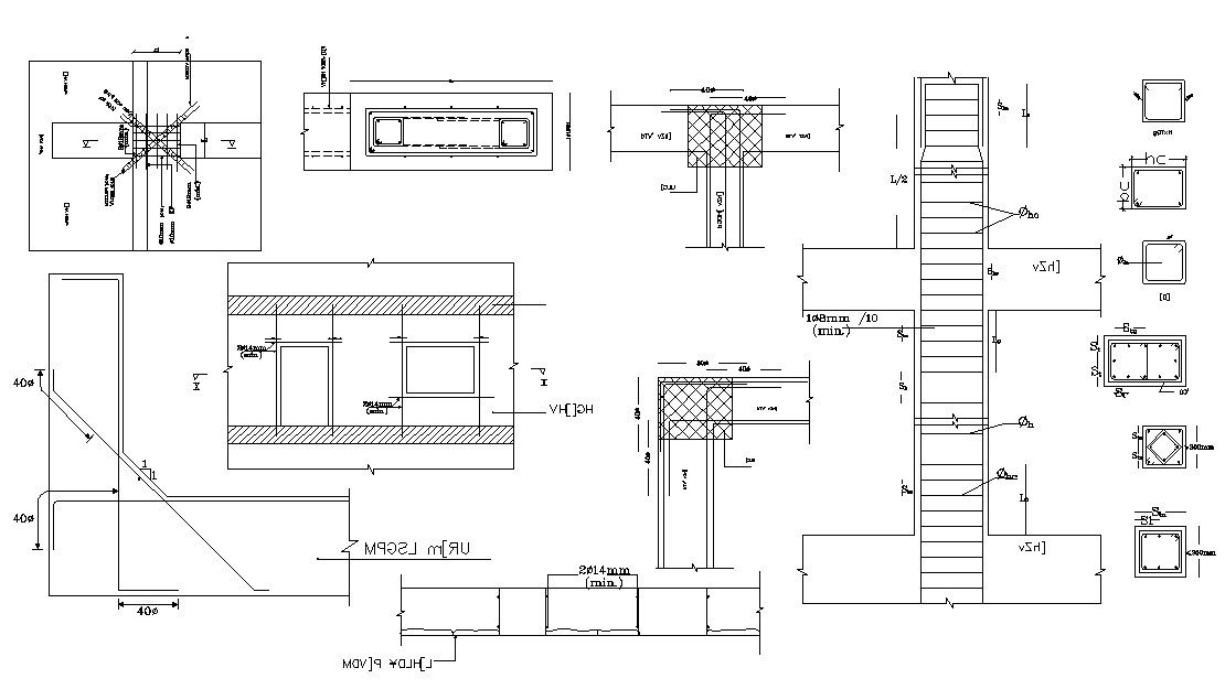 Reinforced Concrete Cement (RCC) Column footing structural works details that show reinforcement curtailment main and distribution bars details along with hook up and bent up bars, stirrups, bar dimension, effective and clear cover, footing size, column size, and various other structural works details. Download RCC works detailing CAD file for free.