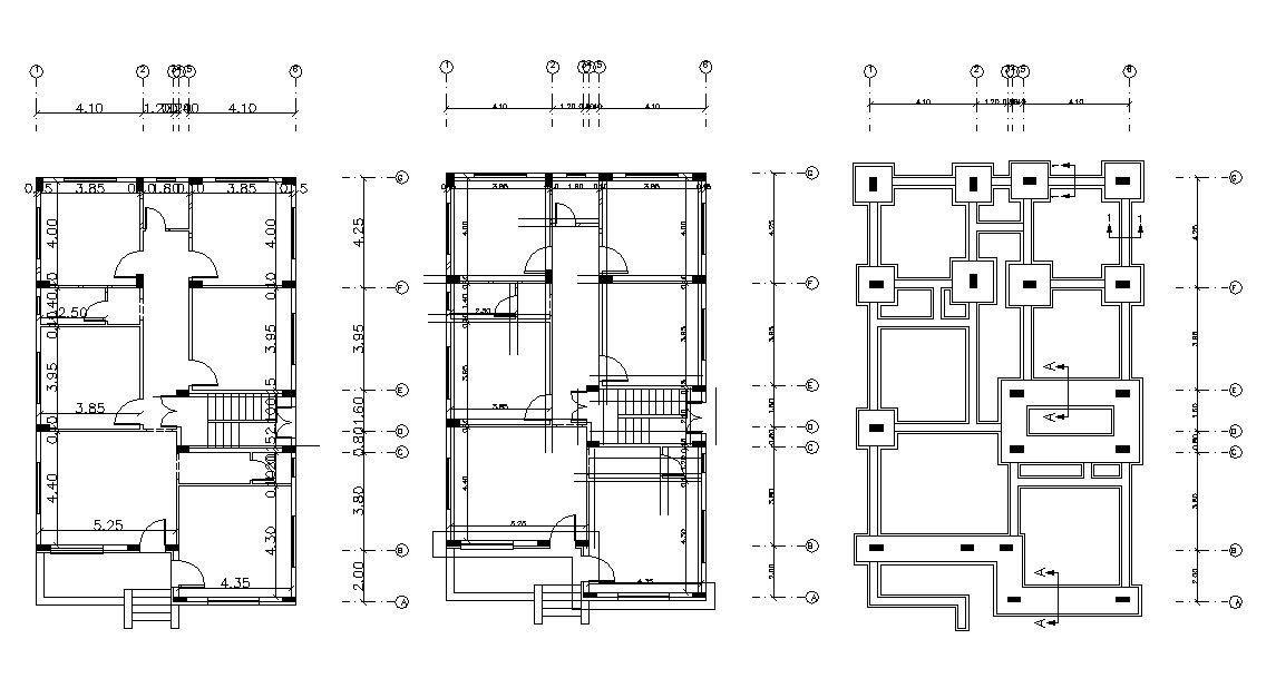 Detailed presented layout plan for residence housing bungalow that shows ground floor and first-floor plan if bungalow with dimension detailing, floor level, staircase design, rooms and various other unit details. Footing detailed plan is also presented in CAD file that can be downloaded for reference plan.