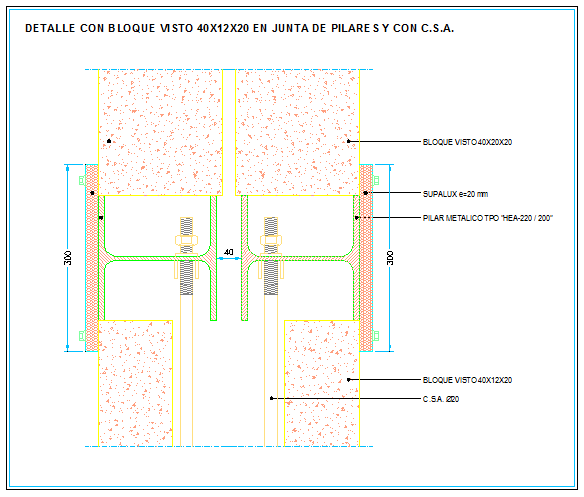 this is a connection to double walls of cement blocks with DETAIL of BLOCK VISTA 40X12X20 IN BOARD OF PILLARS AND WITH C.S.A., Metalik pillar detail in this drawing.