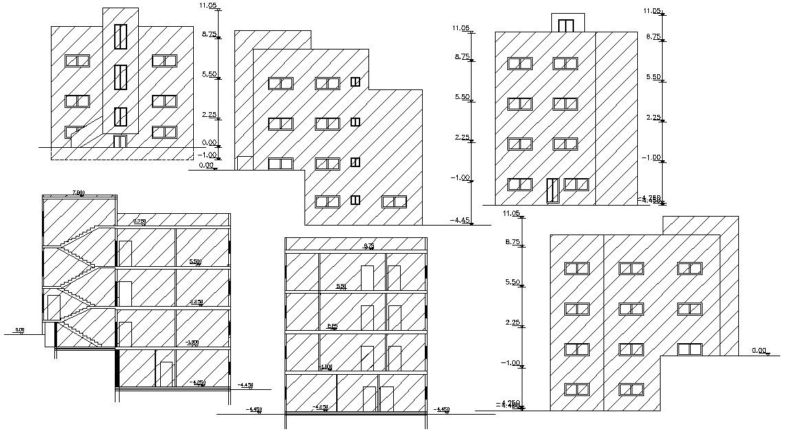 Free download residence housing apartment elevation and sectional CAD file that shows living apartment different sides of elevation design like front elevation, sides elevation and rear elevation along with floor leveling details.