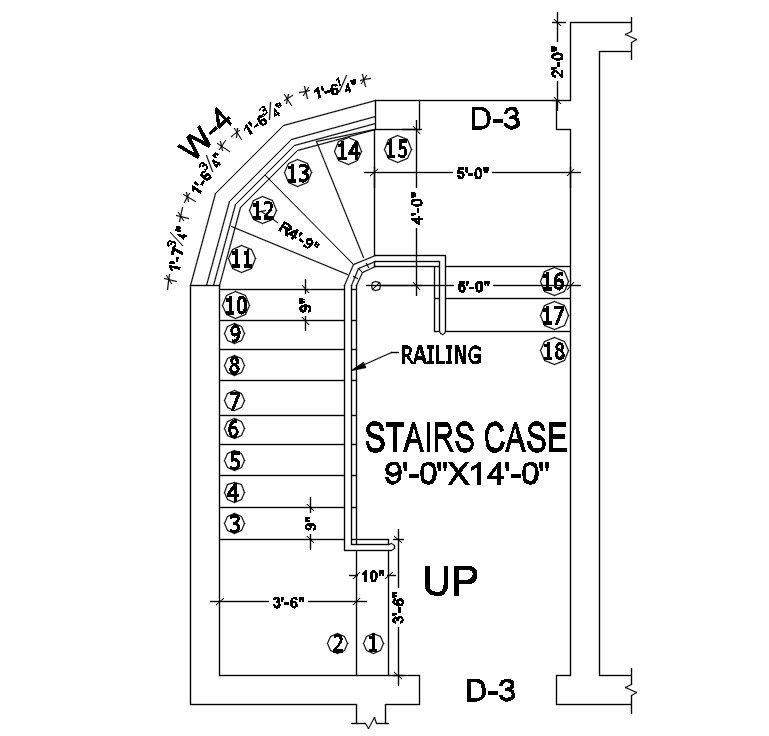 AutoCAD drawing of staircase plan top view shows trade and raise with supported wall and railing design. download free 9'X14' staircase plan DWG file.