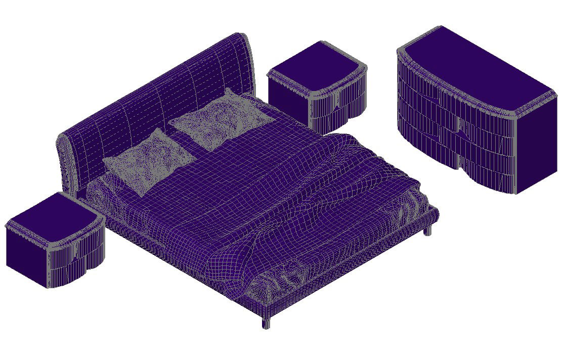 3d model of lowest double bed with side table design and also has mattress, cushion and headboard. download free DWG file of double bed design.