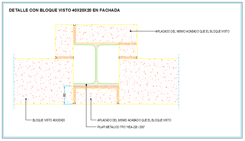 connection wall of concrete blocks with cover metallic pillar drawing with BLOCK 40X20X20 , Cladding finish and metal pillar detail in this file.