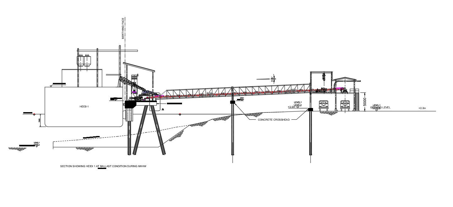 The Sectional drawing of the HEIDI at ballast condition during MHHW is available. Download the AutoCAD DWG file.
