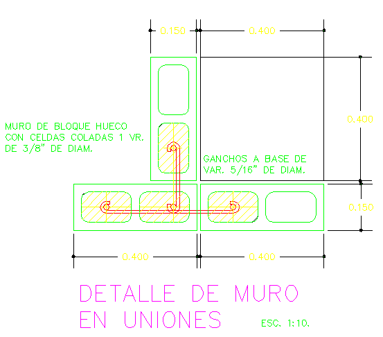 walls of blocks in concrete-start detail with section plan of wall in unions work mentioned in this drawing.