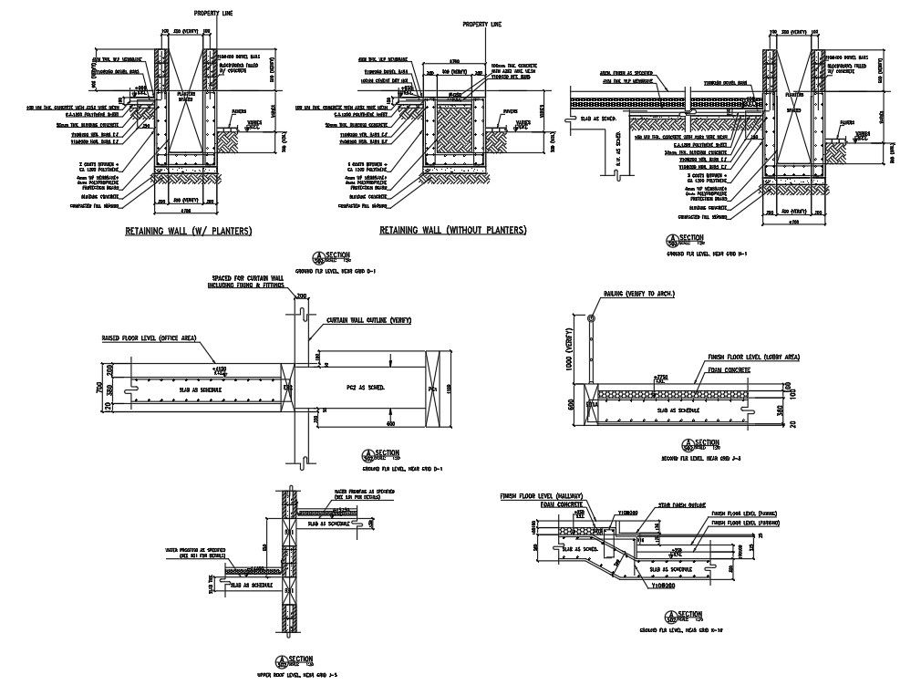Retaining walls with planters and without planters section details are given in this AutoCAD DWG drawing. The section details are clearly given in this drawing file. Also, the schedules slab reinforcement details are given in this DWG file. Download the AutoCAD 2D DWG file. Thank you so much for downloading DWG file from our website