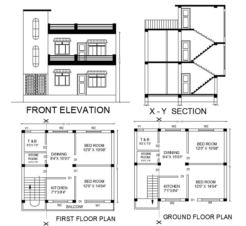 24'X30' architecture AutoCAD house ground floor and first-floor plan CAD drawing includes 2 bedrooms, kitchen, dining area, storeroom, toilet bathrooms, and staircase design. also has house building section drawing and front elevation design. download 2 storey 2 BHK house plan drawing DWG file