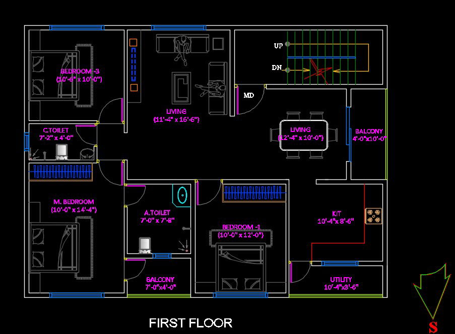 3 bhk floor plan north facing main door living and dining (with balcony ) master bed room with attached toilet and balcony, 1 common toilet, 2 bed room and kitchen with utility area. download modern architecture house plan with interior design DWG file.