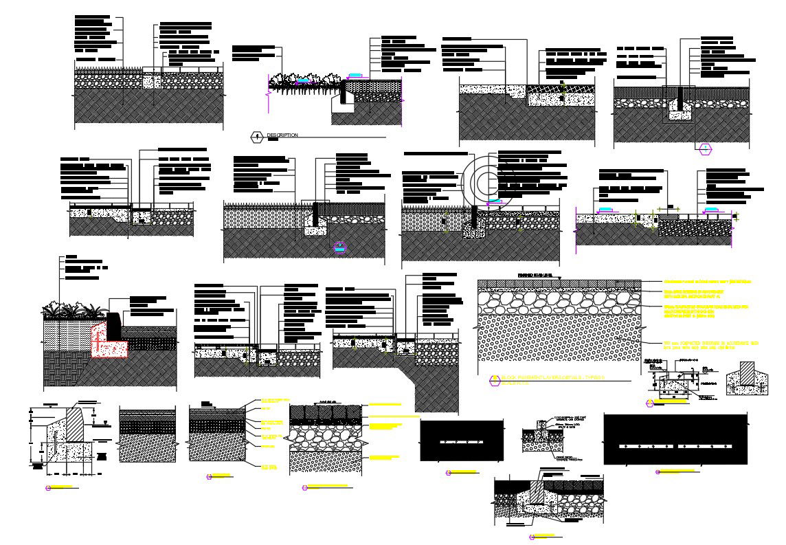 2D CAD Drawing of the typical detail of planting area and jogging track of the road is shownThe plantation details has been given, material used for the jogging track , road are given.The dimension of the kerb are given properly car wheel and bus wheel stopper details has been given correctly. All the section details are given with the proper material details. Materials used are like polythene sheets, granite pavers, concrete, asphalt etc. Download the DWG AutoCAD file.Thanks for Downloading AutoCAD DWG and other CAD program files from our website.