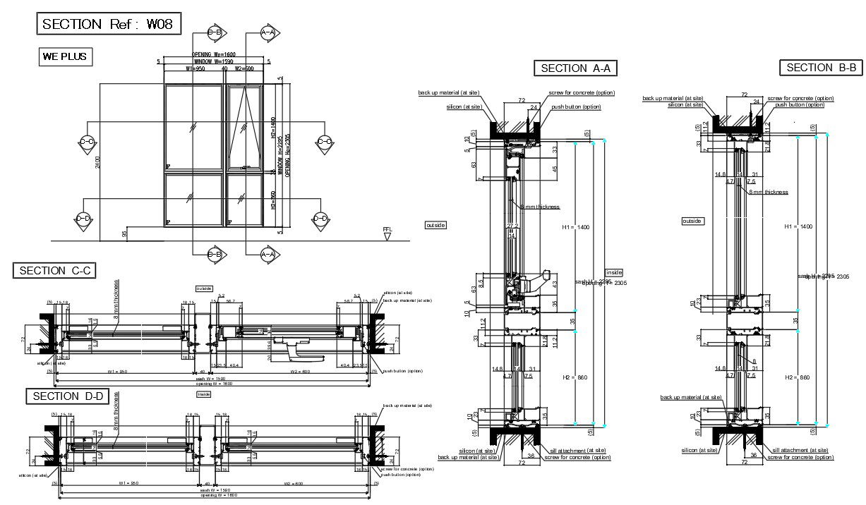 AutoCAD DWG Drawing of the section plan details of the sliding windows. Download the Autocad DWG 2D file.