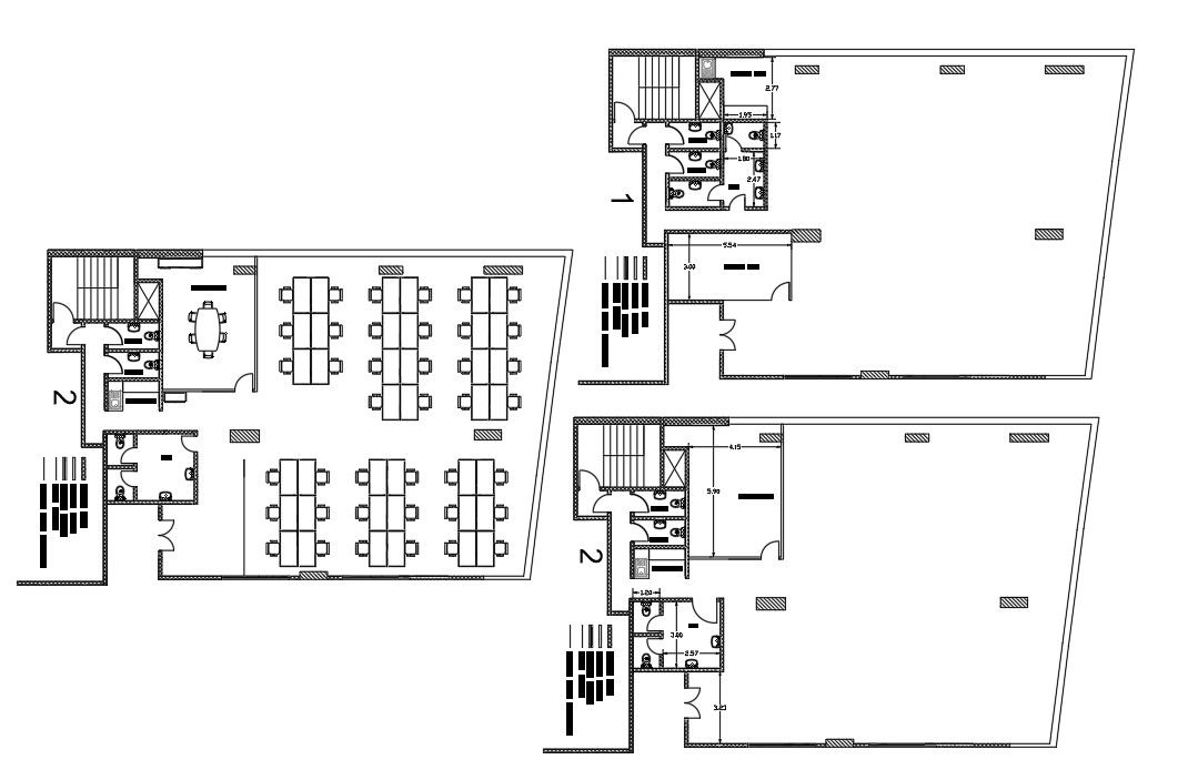 Autocad drawing file gives the detail of the office plan layout G+2. The ground floor plan area has the parking area , three toilets, two for women and one for men and a meeting room and stair case. The first floor in the plan gives the detail of the office rooms and toilets. The second floor in the drawing gives the detail of the work place and the meeting room, the work place has the tables and chair in the drawing. Two side of the building are built with glass panels and the other two sides are constructed with cement wall, the partitions are made with gypsum boards, sliding windows are provided for ventilation. The cement wall, gypsum board, sliding windows, glass panels, security glass partition are differentiated in the diagram. . Thanks for Downloading AutoCAD DWG and other CAD program files from our website.