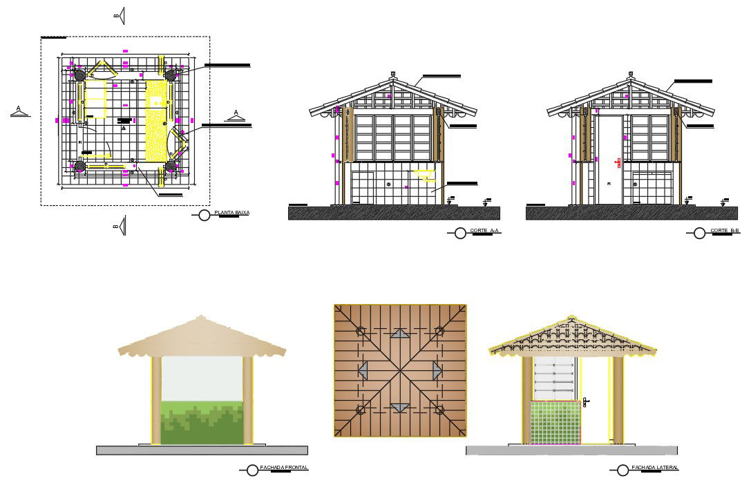 Autocad drawing file gives the plan, elevation and sectional detail of MULTIPURPOSE KIOSK. The kiosk is of area 9sq.m dimension is 3m x 3m. circular varnished eucalyptus wood has been used as a column for kiosk in the four corners of dia 250mm and 100mm x 150mm wooden beam has been used. For the ventilation wooden buckle windows have been given and the granite flooring has been made, a refrigerator has been placed in the kiosk, the walls of the kiosk has been given with the ceramic tiles. The roof is of tent type roof the roof is covered with ceramic tile. The elevation of the kiosk is given in detail in the drawing. Thanks for Downloading AutoCAD DWG and other CAD program files from our website.