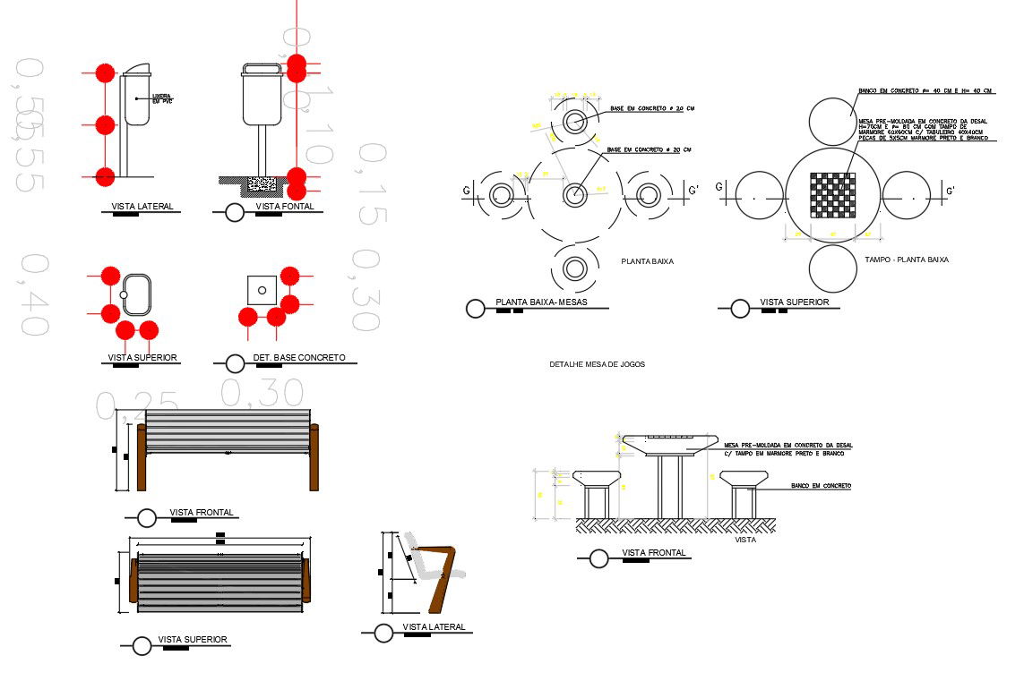 2D Autocad drawing file gives the detail of the plan elevation and sectional detail of the furnitures. The plan and sectional drawing gives the detail of the furnitures and their details with the dimension. The furniture gives detail of a circular table surrounded by circular chairs, the base of the table is of concrete with 20cm dia, the top surface is of 50 cm radius, the top surface is covered with marble with the centre with square black and white marble for design. A stone chair is given in the diagram with the height of 850mm , length of the chair is 1.91m, width is about 640mm. A trash can is given with the height of 1.10m the trash can is supported by a concrete base of 300mm x 300mm, the trash can size is 250mm x 400mm given in the cad drawing. Thanks for Downloading AutoCAD DWG and other CAD program files from our website.