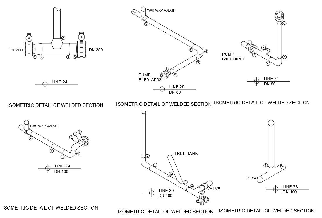 Isometric view of the welded section detailed drawing is given in this CAD DWG file. End cap is used to protecting the end of pipe and other fittings, so the shape are designed according to the shape of pipe line. The two way valve is provide to shut off water flow or to control regulate flow through a pipe. Download the DWG Autocad file.