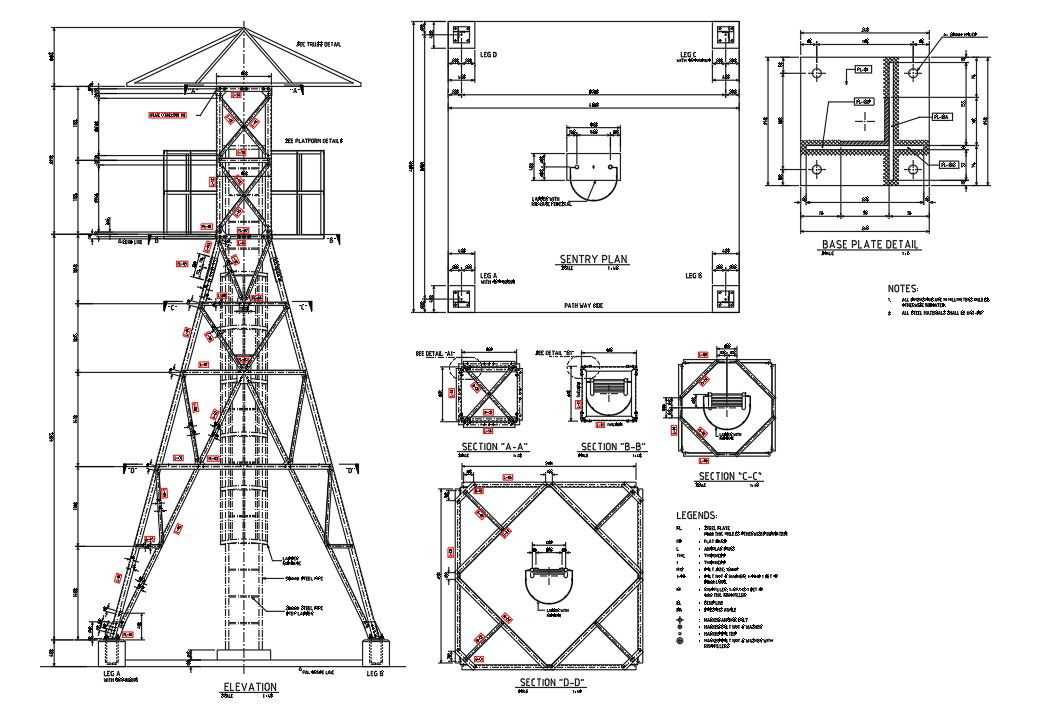 DWG AutoCAD drawing file gives the Details of Sentry Plan & Elevation of Steel Tower with Ladder Rib Cage.This DWG file having steel plate and Plate connection details available.A lattice tower, also called angle steel tower or electrical tower, is one kind of freestanding framework tower for power transmission line of all voltages, often designed as a space frame or a hyperboloid structure. The most common lattice tower is used for high voltage transmission lines.A transmission tower or power tower (alternatively electricity pylon or variations) is a tall structure, usually a steel lattice tower, used to support an overhead power line.Transmission towers and their overhead power lines are often considered to be a form of visual pollution.The drawing having the steel fabrication , different materials used ,bolt size,cut sections,steel pipe diameters,reinforcement details,parts of each ladders and description are clearly explained in this Drawing.Download the AutoCAD DWG file.Thank you so much for downloading AutoCAD files from cadbull website.