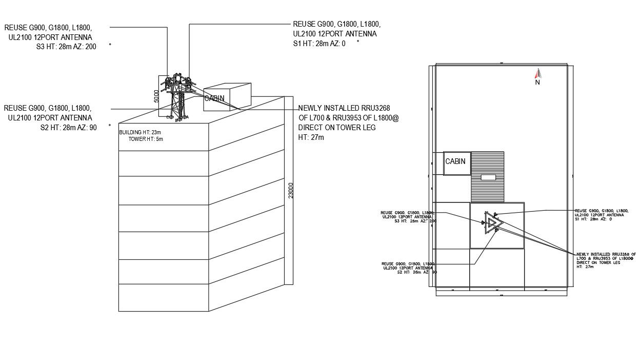 Autocad drawing file having plan and elevation details of 12 Ports Panel Antenna installed above a building. The Building height is 23 m & Tower height is 5 m. A ladder is placed placed from the cabin to the tower to reach the tower. The tower is made of 3 legged stainless steel with the height of 5m. The elevation gives the diagram of the footing in the tower and the placement of the antenna in the tower. Thanks for Downloading AutoCAD DWG and other CAD program files from our website.