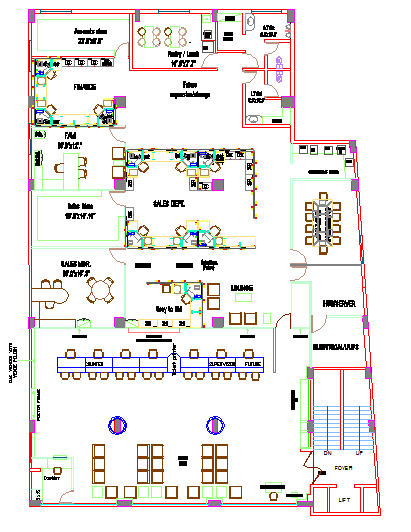 Floor detail in Accounts store, Financial area, Pantry/ Lunch area, Sales department, Lounge, reception table, Waiting area, & entrance foyer etc.