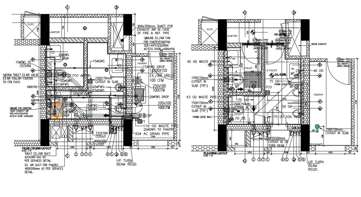Public toilet layout plan CAD drawing includes sanitary ware and plumbing installation detail, air duct for pantry 400x200mm as per services detail, flooring flashing flange 90° bend drain pipe. also has single hole mixer for hot and cold water supply. download toilet plan water and pipe and drain main network connection detail DWG file.