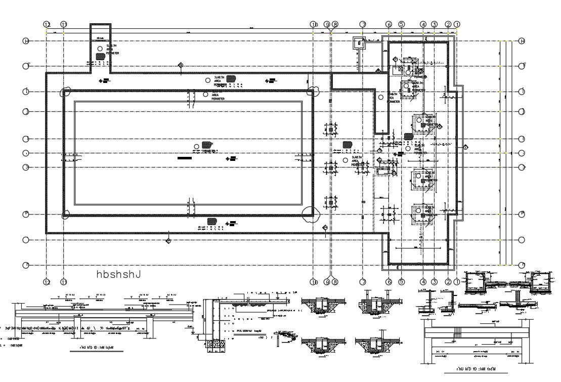 the swimming pool plan CAD drawing includes section drawing gives the detail of the swimming pool basement surface details and the material specification used for the construction. The swimming pool bar is made with wooden hut type bar with wooden polymer composite material. download DWG file of swimming pool center line plan drawing DWG file.