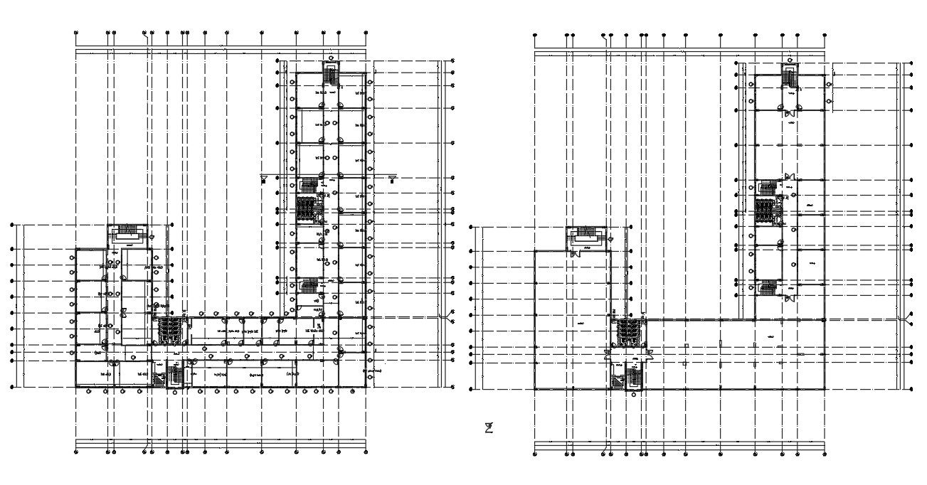 2d CAD drawing of school center line plan ground floor and first floor detail that shows class room, staff room offices, and toilet on each floor level with all dimension detail. download school building working layout plan DWG file