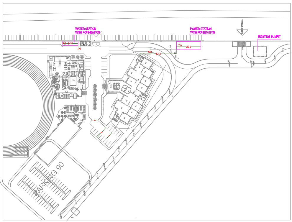 Layout of SOG school of power station with foundation, Water station and existing sumpit were given in 2D DWG drawing file Download the DWG Autocad file.
