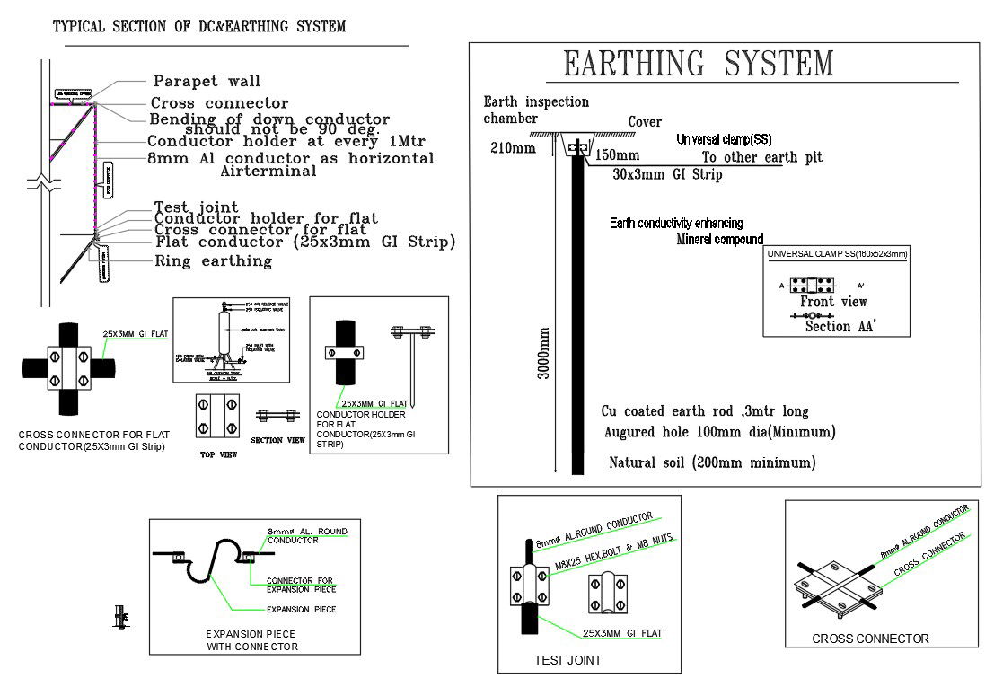 File shows the typical section of DC and Earthing system of office building in the 2D Autocad DWG drawing model. Earth conductivity enhancing the mineral compound. Cross connector for flat conductor were given with the size of 25x3mm. Test joint, conductor holder for flat, cross connector for flat, flat conductor and ring earthing. Air cushion tank is provided and drain valve and inlet with isolating valve. Thanks for downloading the autocad 2D DWG drawing file and other CAD program from the our cadbull website.