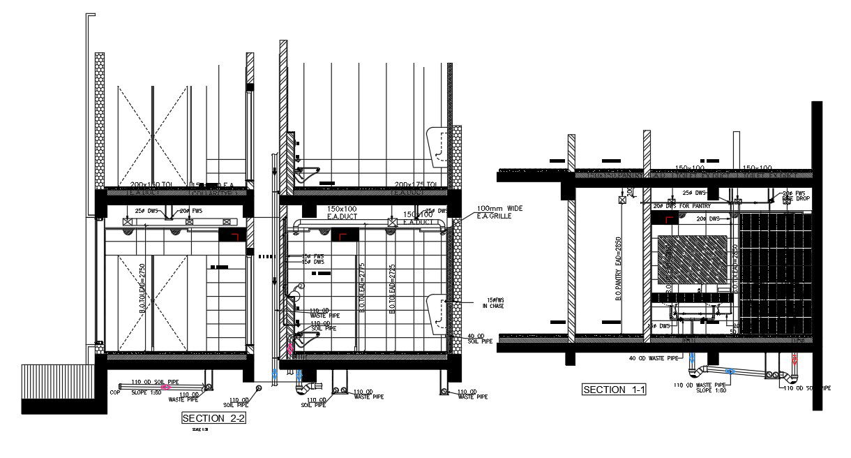 The ground floor toilet details and section details of office building were given in this file with 2D Autocad drawing model. Section 1-1, 2-2 explains the pipe connection of the toilets. Soil pipe is designed to carry soiled water from the toilet, urinal or bidet to the sewer. A waste pipe carries water from shower and bath. Thanks for downloading the autocad 2D DWG drawing file and other CAD program from the our cadbull website.