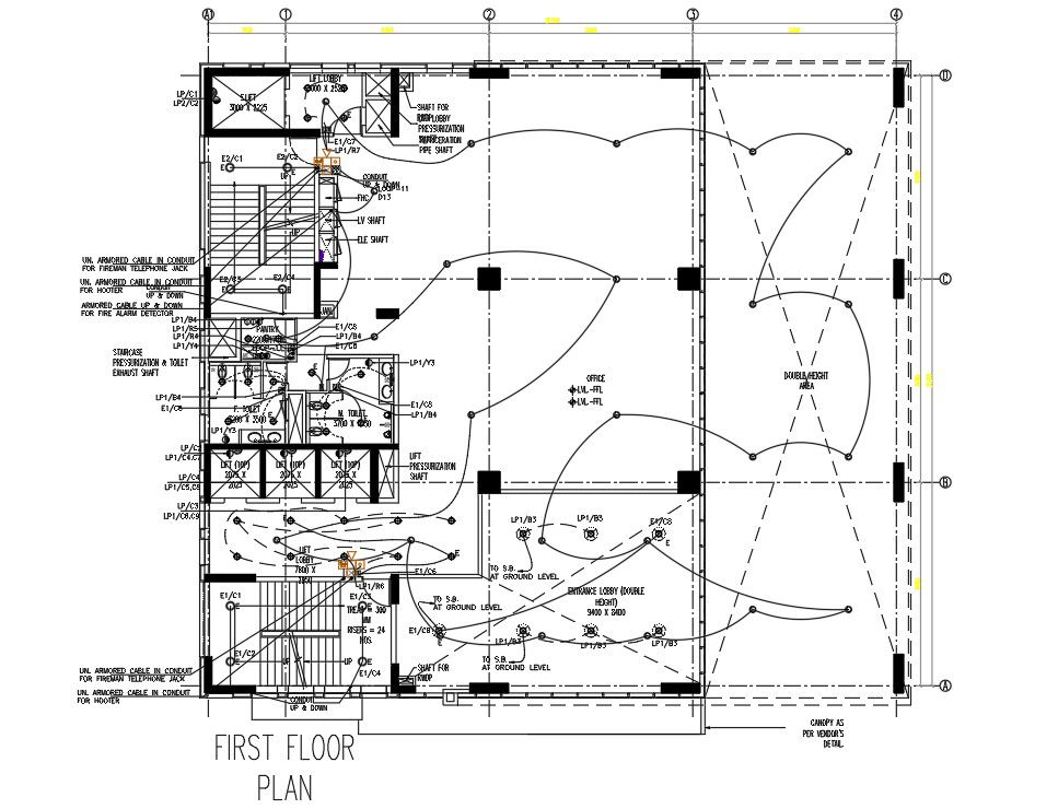 File shows the first floor plan of Inspire business park office building in the Autocad 2D model. This floor contains entrance lobby, Male and female toilets, office room, lift, staircase, double height area and lift lobby etc., Dimensions and another details were given in this file. Thanks for downloading autocad file from our cadbull website.