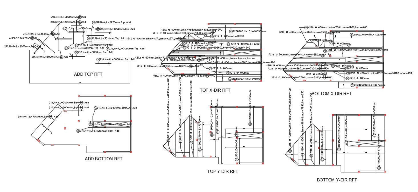 File shows the Running footing (RFT) direction in 2D Autocad DWG drawing file. In this file top X- direction RFT, Y- direction RFT, X- Bottom X - Direction, Y - Direction, top RFT and bottom RFT details were mentioned clearly. Number of bars used, size of bars used, length and breath of the footing were given with dimension. Thanks for downloading Autocad 2D drawing file and other CAD program file from our website.